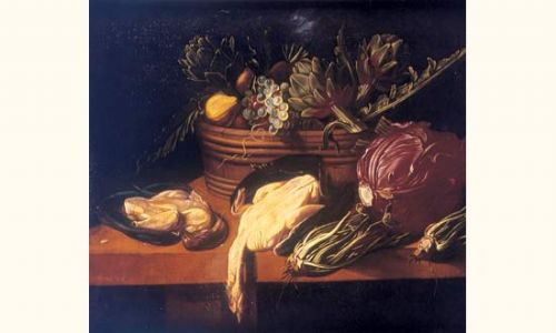 Nature morte au panier de légumes et gibiers