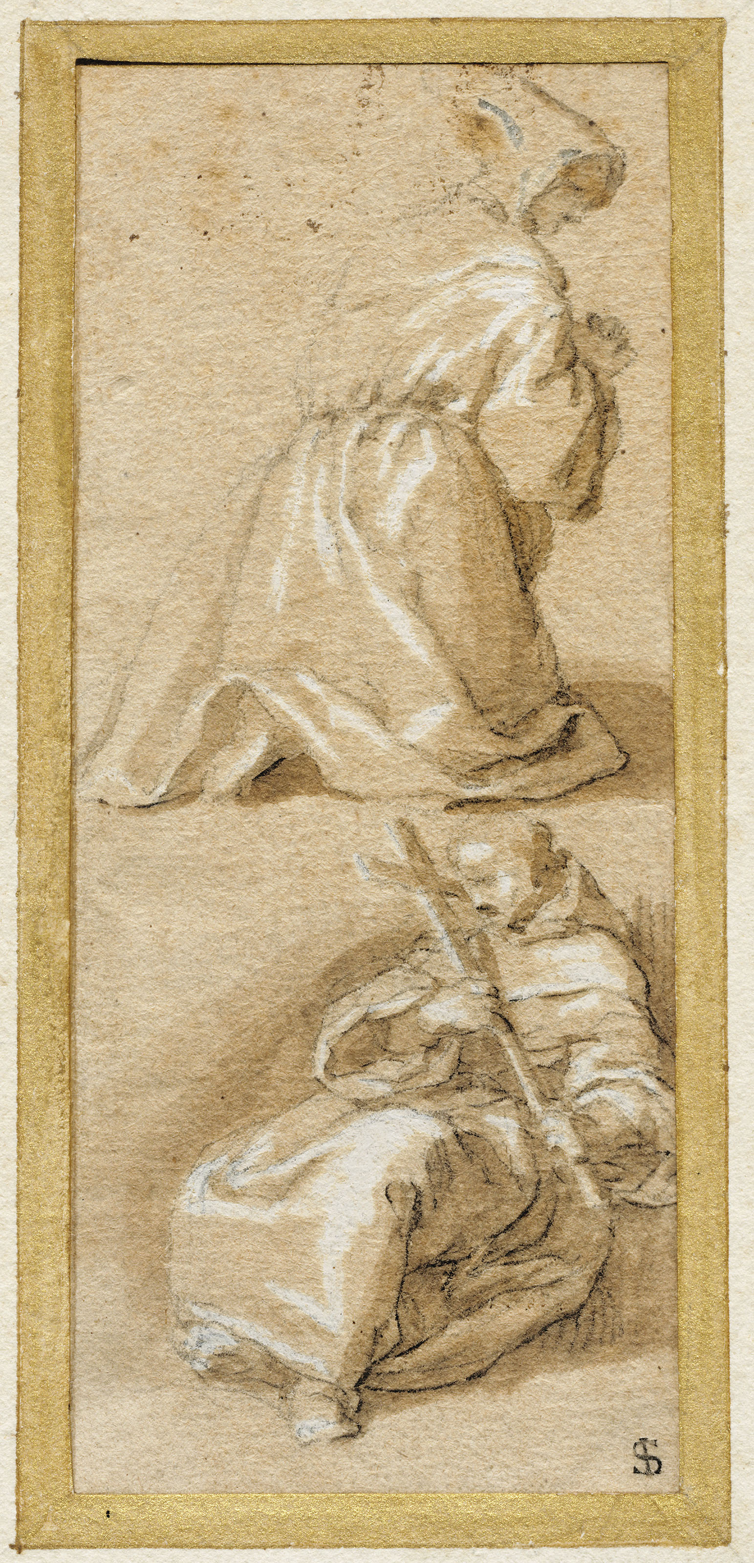 | Chalk brown wash heightened with white (slightly oxidized in places), partial brown ink framing lines | |