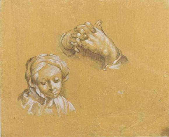 | Study of woman's head with folded hands. | |