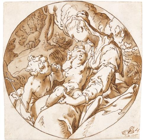 | Pen and brown ink and wash over black chalk, within a drawn circle | |