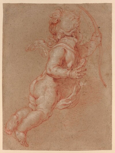 | Feuille d'étude recto verso : Putto de dos brandissant un arc ; Corbeille fleurie et drapé | |