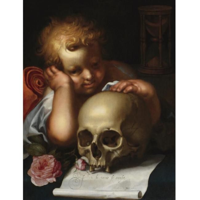VANITAS WITH A PUTTO RESTING HIS HAND ON A SKULL