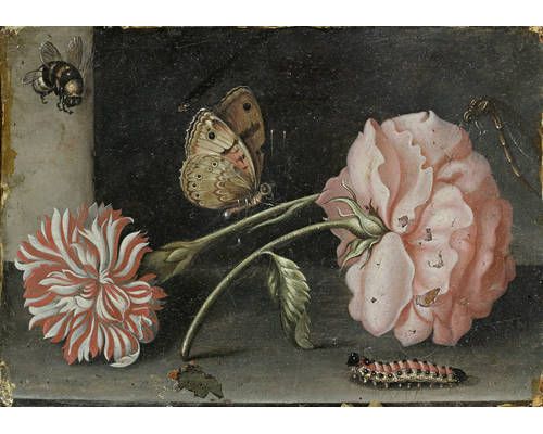 | A pink rose and a red and white carnation on a stone ledge with a bee, a butterfly, a dragonfly and a caterpillar | |