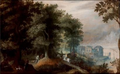 | Scène de chasse à courre dans une forêt près d'un lac | |