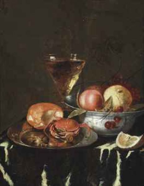 | A crab on a pewter platter, a peach, cherries in a pewter bowl and a wine glass, on a draped table | |