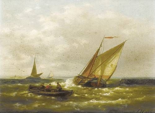 | A Dutch barge running out to sea on the tide with other craft beyond | |