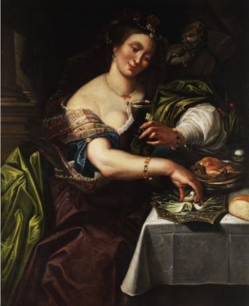 JUNGE FRAU MIT WEINGLAS UND EINEM ÄFFCHEN AN EINEM GEDECKTEN TISCH