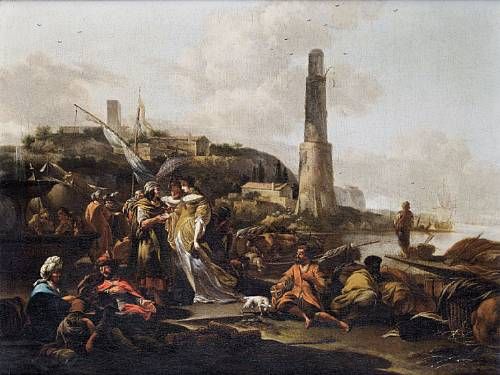 | Figures on a shore listening to a fortune teller, a Mediterranean city in the distance | |