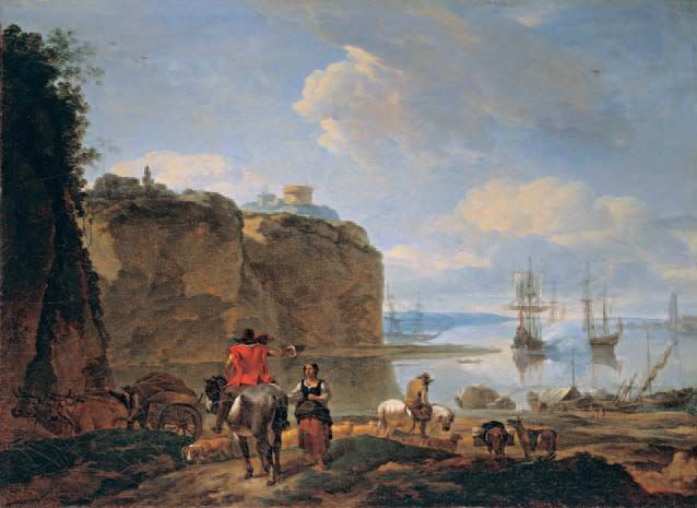 KÜSTENLANDSCHAFT MIT REITERN UND SEGELSCHIFFEN