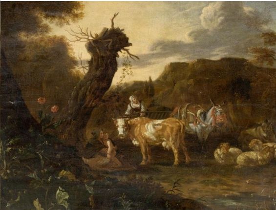 | Two peasant women with child, two donkeys, a cow and sheep in a landscape. | |