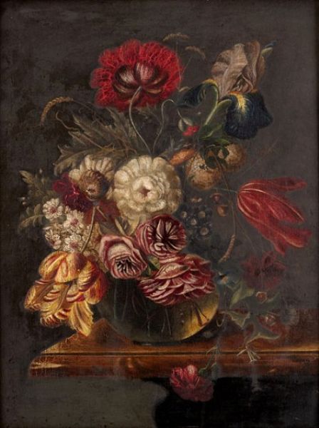 MIXED FLOWERS IN A GLASS VASE ON A STONE LEDGE