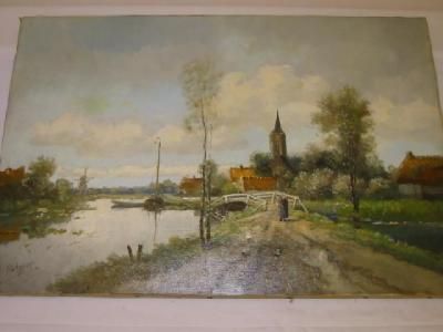 | Dutch Canal Scene with Village, Figure and Chicks in the Foreground | |