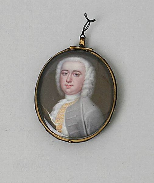 | Dr. William Wasey (died 1757), wearing grey coat over white waistcoat trimmed with gold and frilled white cravat, his hair curle | |