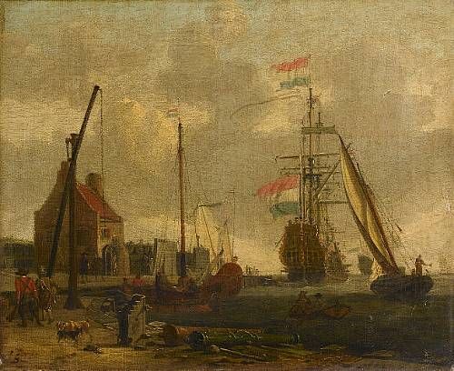 | A Dutch man o'war and other vessels off a fortified harbour with canon and soldiers on the quayside in the foreground | |