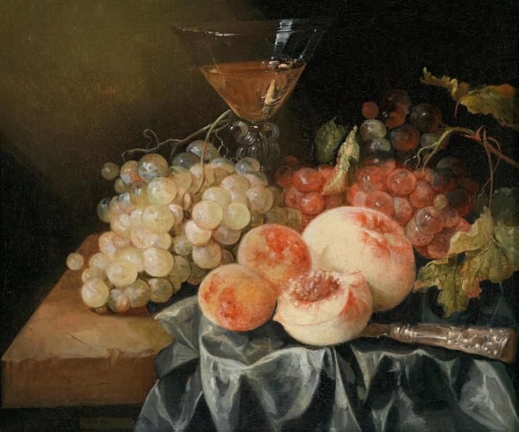 A still life with peaches, grapes and a glass of wine