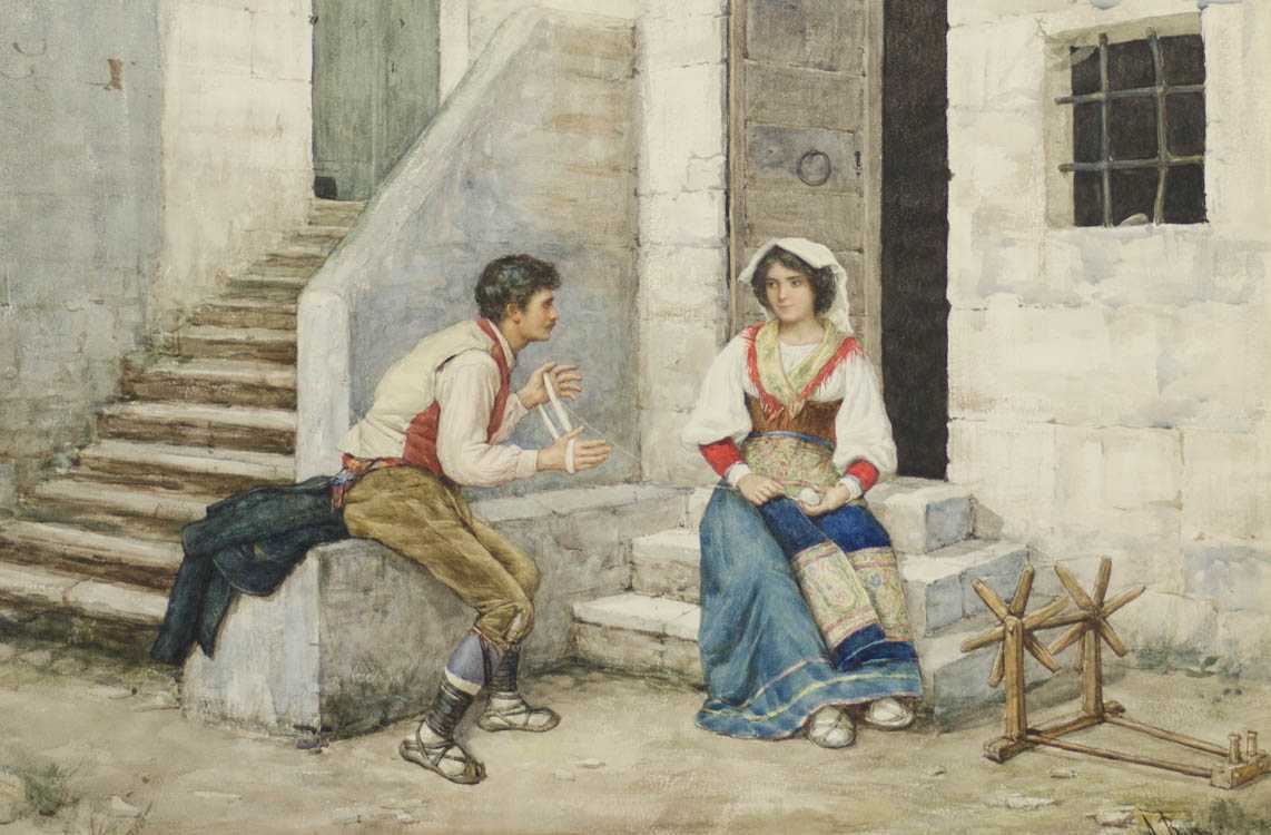 | Courtyard scene with a man and woman working with yarn | |