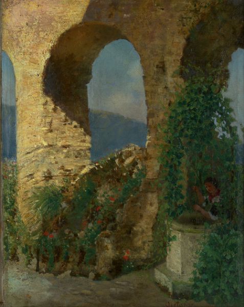 Junge Frau am Brunnen unter einem Ruinenbogen