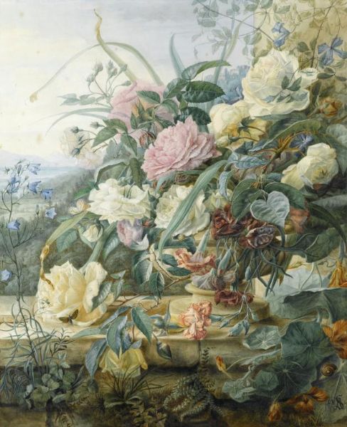 ROSES AND OTHER FLOWERS IN A SCULPTED URN ON A GARDEN WALL