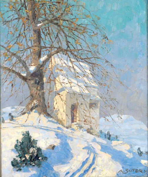 Verschneite Winterlandschaft im Sonnenlicht, mit kleiner Kapelle und Baum