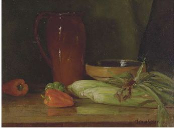 Still life of corn and peppers on a table