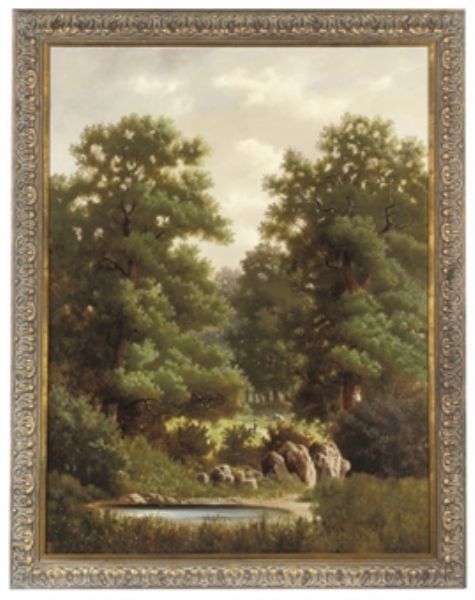 A figure in a wooded glade, a pond in the foreground
