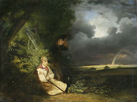 Chasseurs au pied d'un arbre sous un ciel orageux