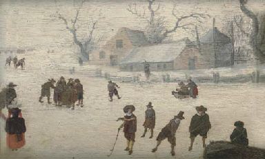 | A winter landscape with figures skating and playing kolf on a frozen river, a village beyond | |