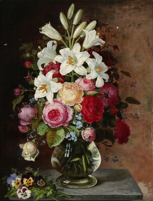 | Still-life with roses, white lillies, forget-me-not and pansies | |