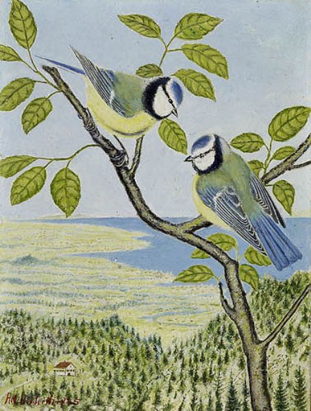 Zwei Blaumeisen vor Seelandschaft. 1945.