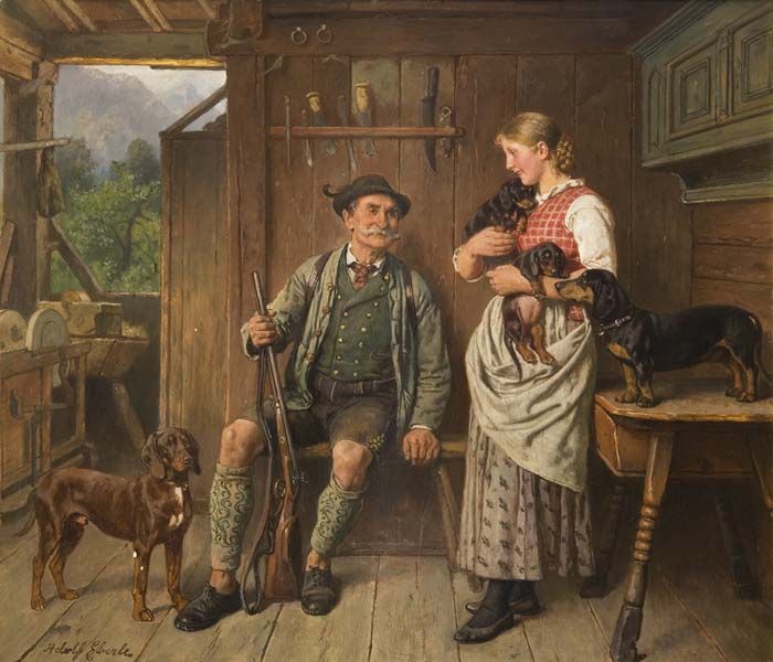 Dirndl, Jäger und Dackelfamilie im Interieur