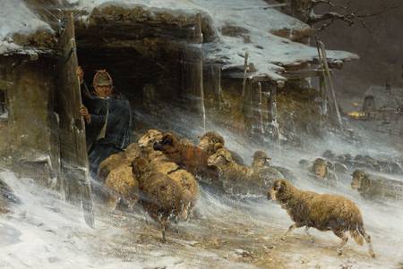Schäfer treibt seine Herde vor dem Schneesturm in den Stall