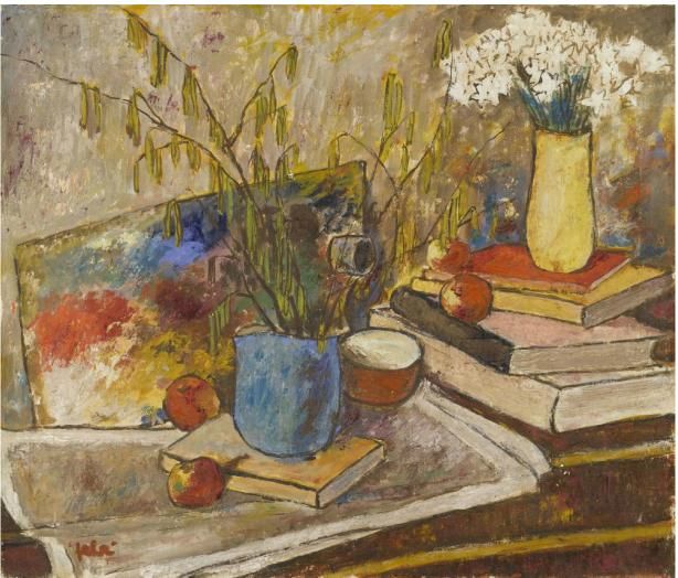 Still life of flowers and books. Mountain landscape, probably Klöntal.