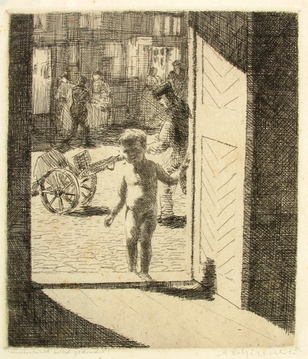 | Kleiner nackter Knabe in der Türöffnung eines Hauses zur Straße hin | |