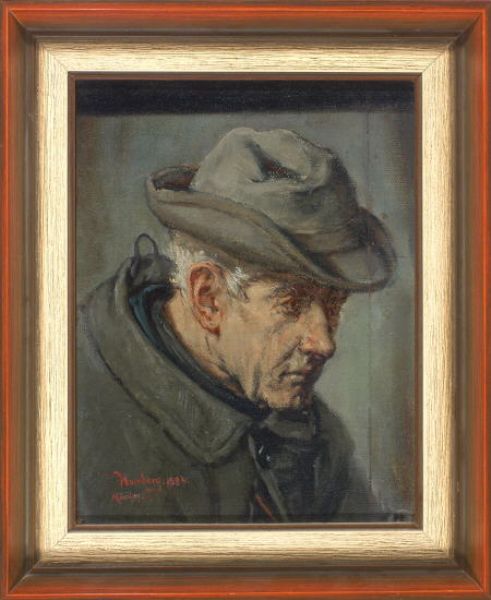 | Portrait eines Herrn mit Hut in Dreiviertelansicht, nach rechts unten blickend | |