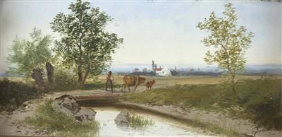 Bauer mit Kuh und Kalb in Landschaft