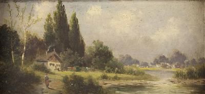 Bäuerin vor Gehöft am Flussufer