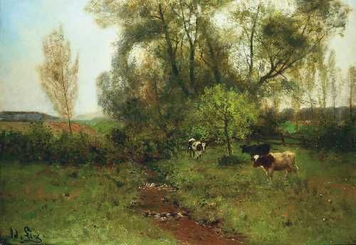 FELDLANDSCHAFT MIT PAPPELN, BACH UND KÜHEN