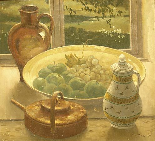 Stillleben mit Tafelgerät auf einem Fensterbrett arrangiert