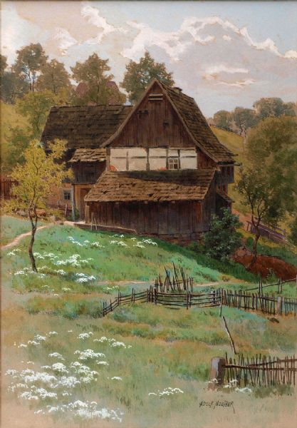 | Frühlingspartie in einem Mittelgebirge. Auf einem baumbestandenen Wiesenhang einsames Bauerngehöft unter sommerlich bewölktem Hi | |