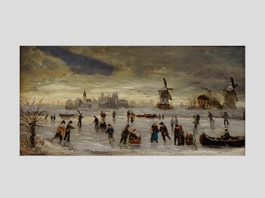 Eisvergnügen vor Dorf, rechts Windmühlen