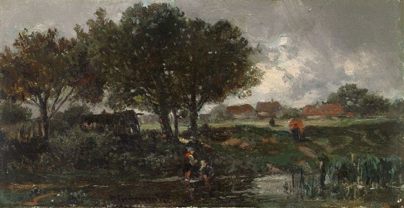 | Sommerliche Idylle bei abziehendem Gewitter mit badenden Kindern an einem Teich | |