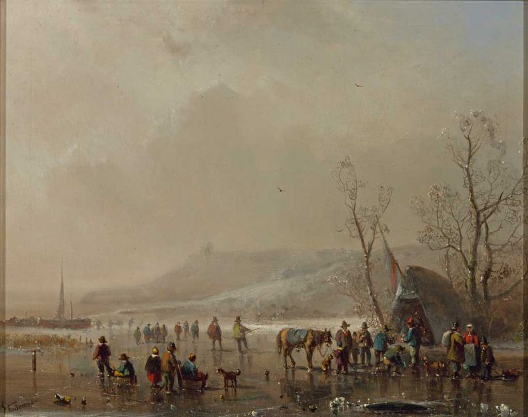 Zahlreiche Personen beim Eisvergnügen auf zugefrorenem Flusslauf.