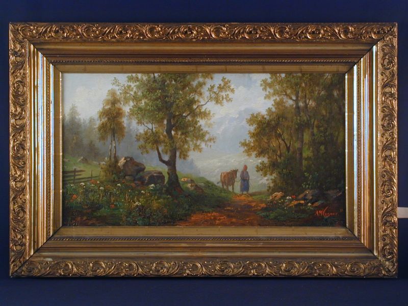 Gebirgslandschaft mit junger Bäuerin bei der Heimkehr