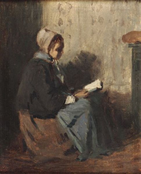 Femme lisant devant l'âtre