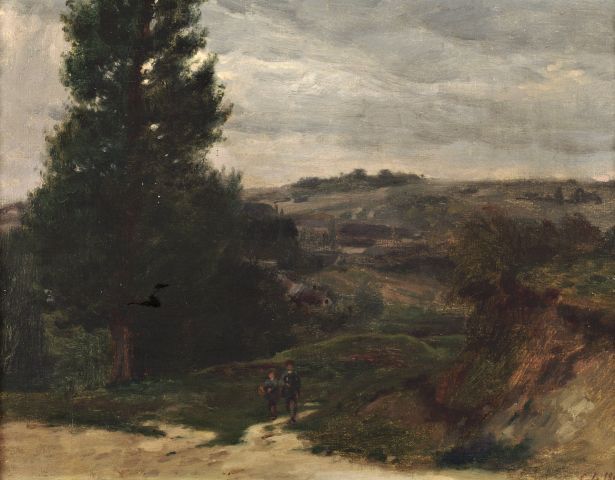 Paysage animé avec deux enfants sur un chemin