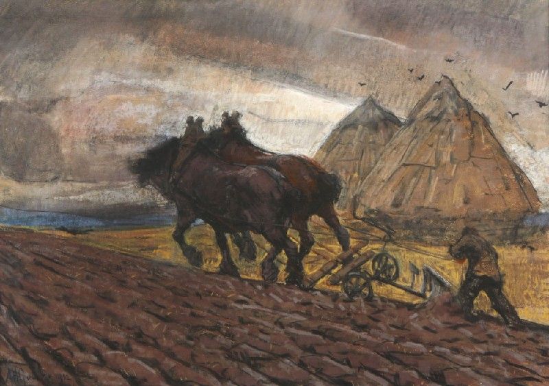 Landscape with ploughing farmer, in the background two haystacks