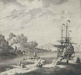 | A Dutch man'o-war at anchor in the Mediterranean, lying off a jetty, with figures on the foreshore | |