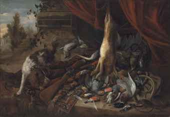 | A hare, blue and yellow tits, a jay, a mallard duck, snipes and a heron on a stone ledge, with a spaniel and a rifle on a carpet | |