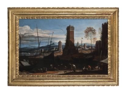 | Port méditerranéen avec bateaux et personnages près d'une ville fortifiée | |