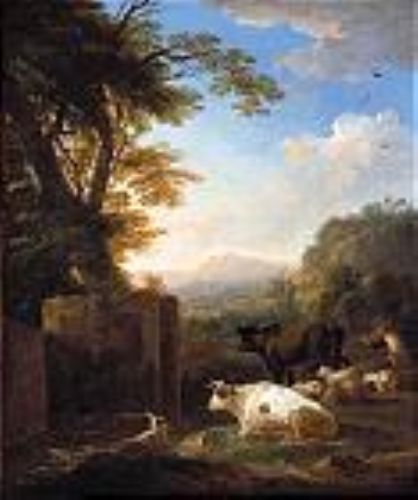 | AN ITALIANATE LANDSCAPE WITH A PIPING HERDSMAN TENDING HIS ANIMALS | |